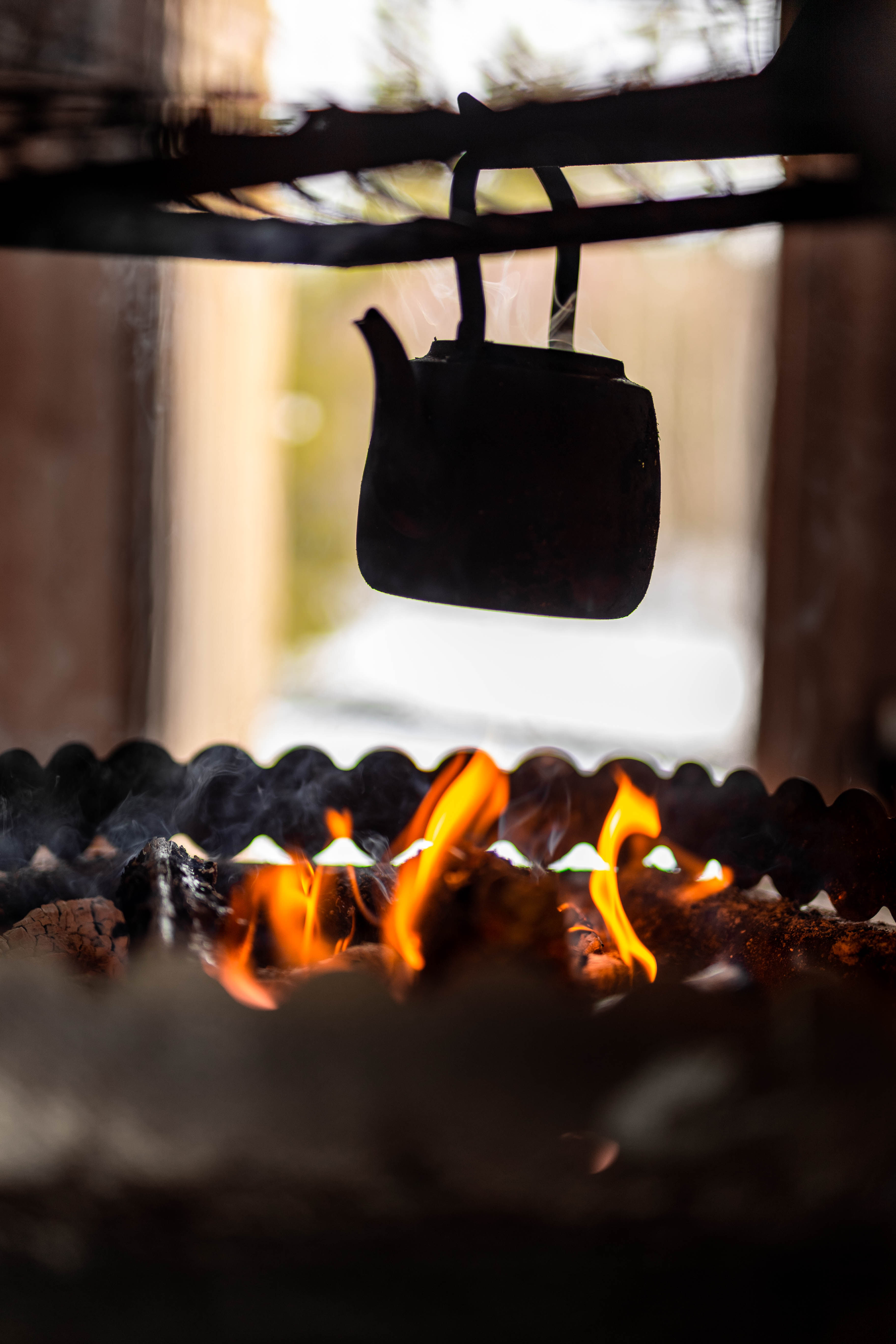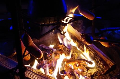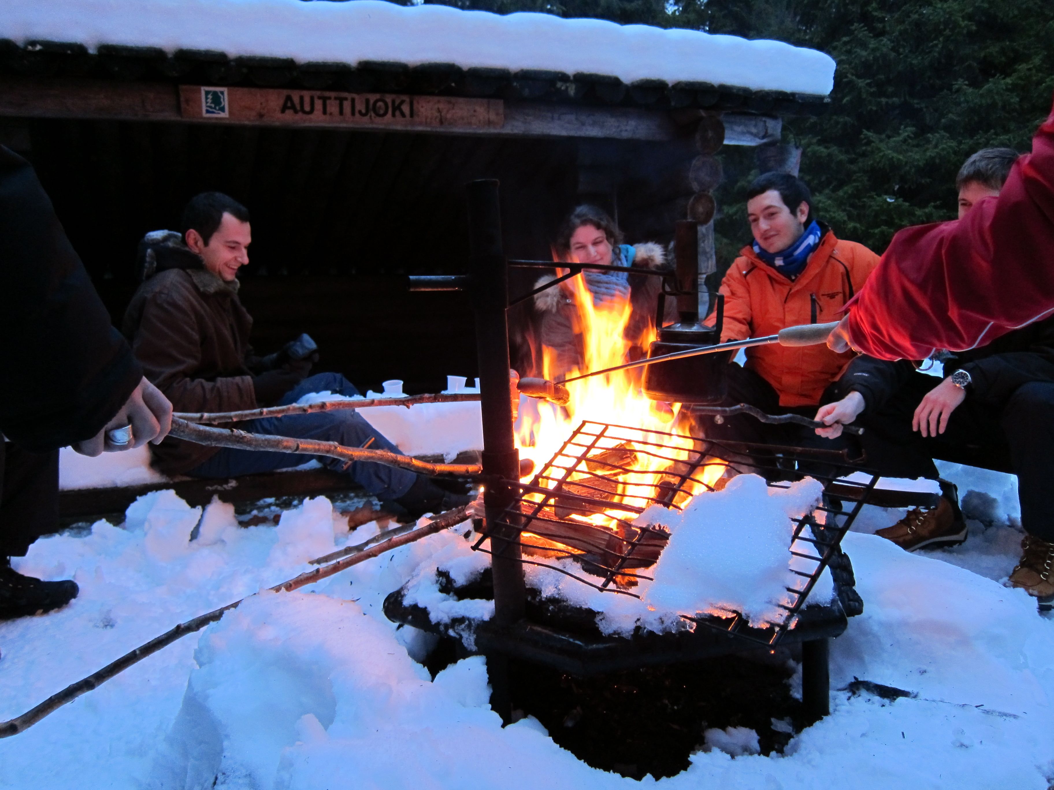 Sitten menemme joen varrelle, takkatulen ympärille mökille, jossa lounaamme grillimakkaramme, kuuman juoman ja jälkiruoan.