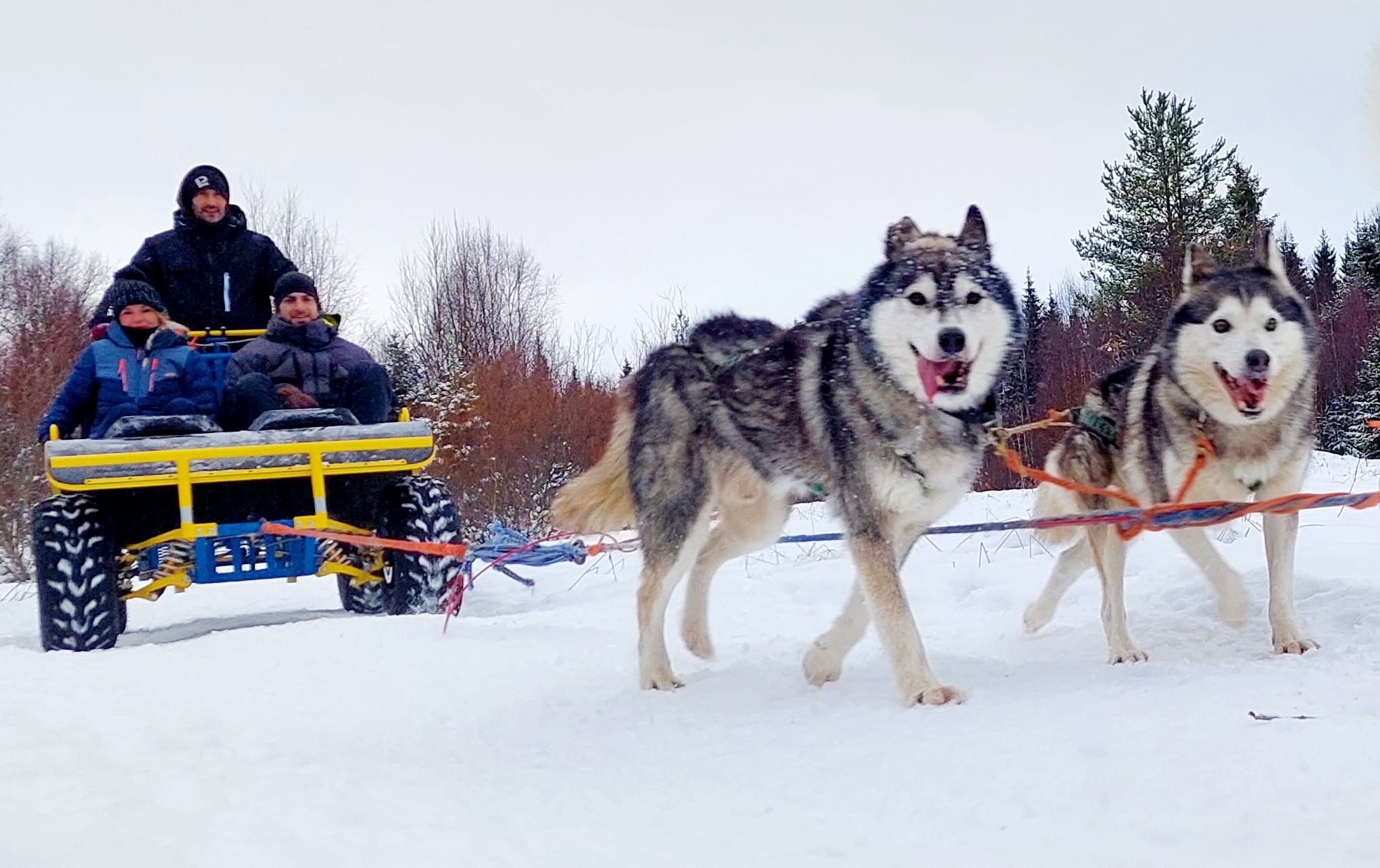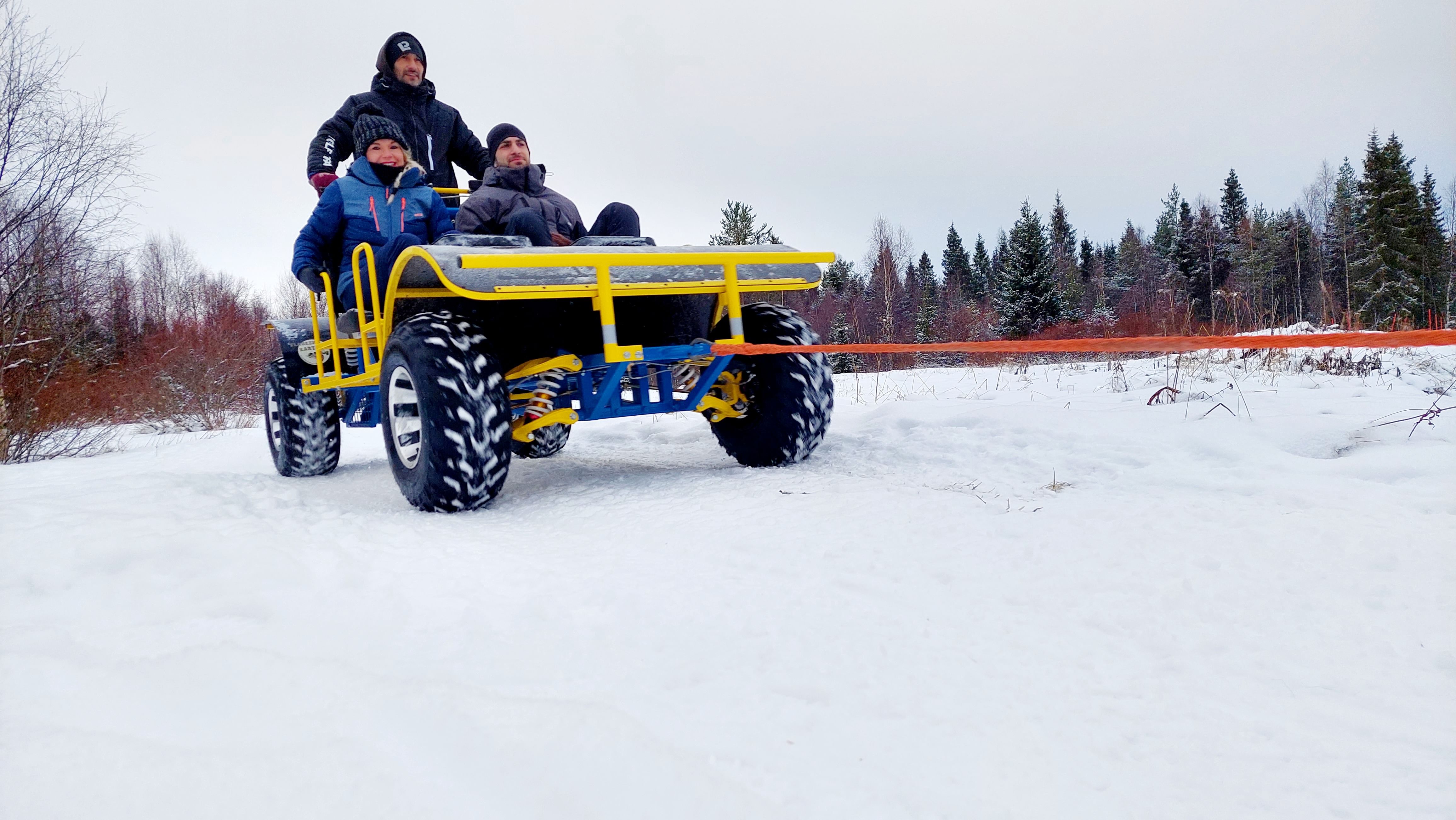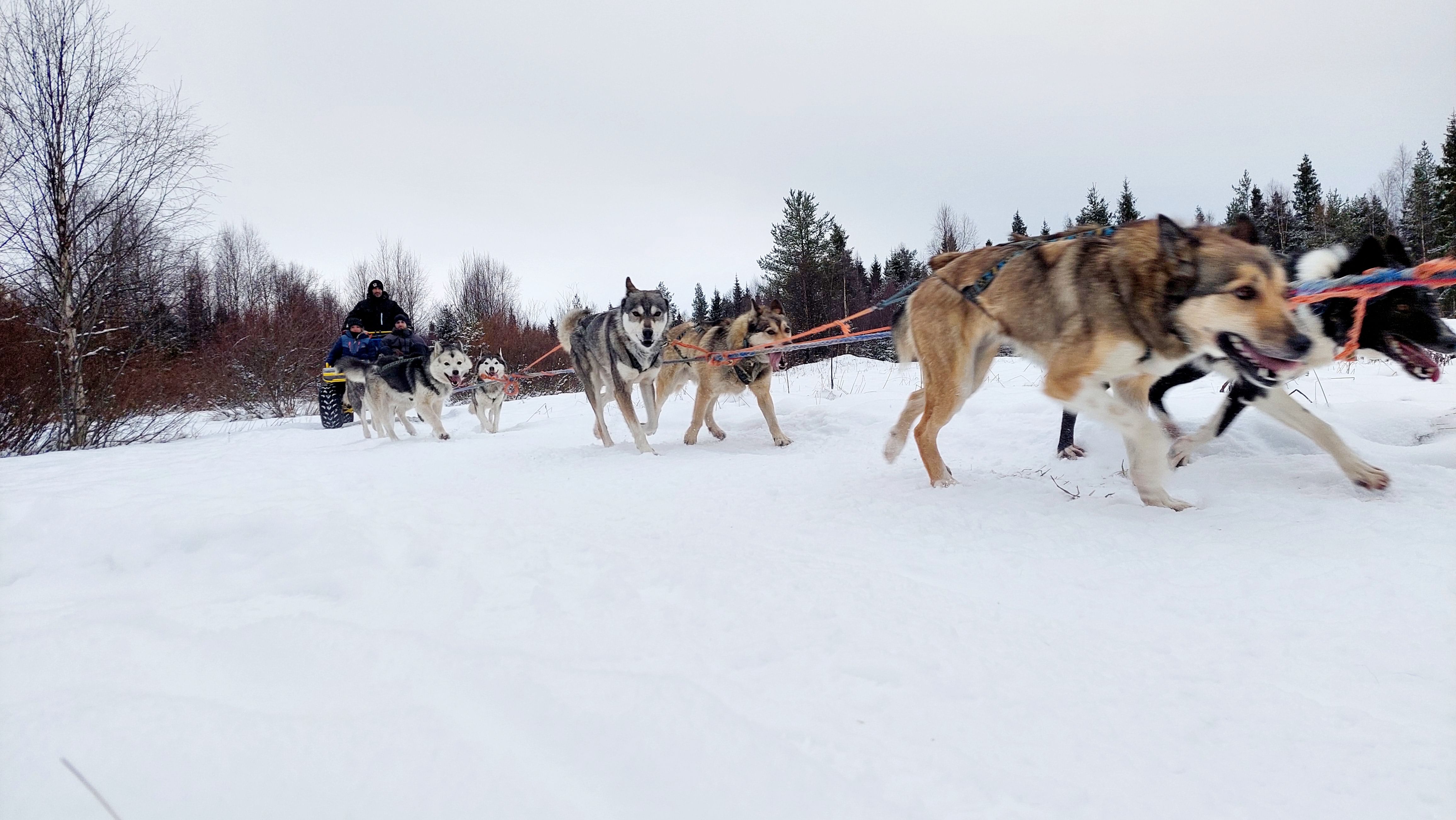 Jos lumi on saapunut, 5 km:n karting-huskysafari korvataan noin 20 minuutin mittaisella huskysafarilla samaan hintaan (eikä siksi palauteta). Rekki on itseajaa.
